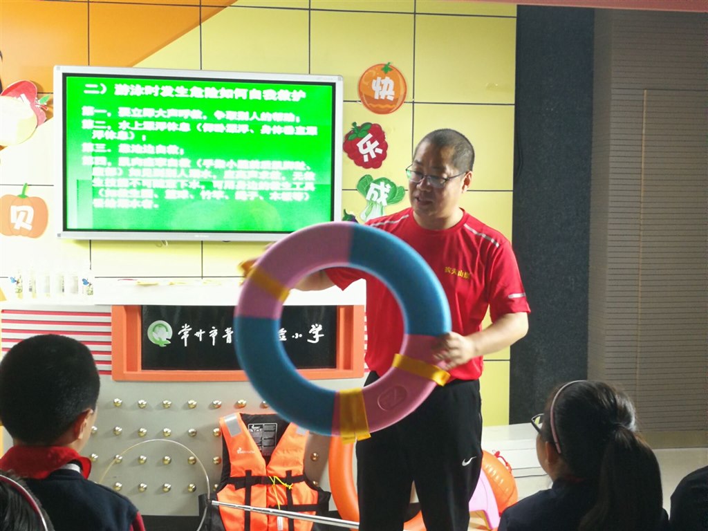 张老师给大家详细讲授了发生溺水事故的原因,怎样预防溺水,如果发生溺水事故的自救方法及施救方法等几方面,让学生深有感触。预防要求家长做到“四知道”(知去向、知同伴、知归时、知内容)。预防要做到“六不准”:不让孩子私自下水游泳;不让孩子擅自与他人结伴下水游泳;不在无家长监护的情况下让孩子下水游泳;不让孩子到无安全设施和救援人员的水域游泳;不让孩子到不熟悉水情的水域游泳;不让孩子到河边玩水、捉虾、钓鱼、摸螺丝(到河滩边洗涮或做家务必须有大人的陪护),还介绍了发生溺水事故时自救和救护的方法。